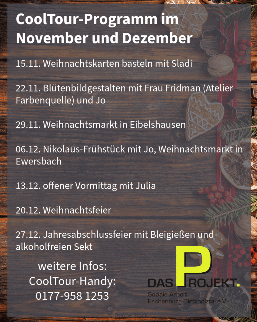 Im CoolTour-Treff sind alle Erwachsenen mit und ohne Behinderung willkommen, egal welchen Alters. In den letzten zwei Monaten des Jahres 2025 haben wir viele schöne Aktionen geplant, alle sind herzlich eingeladen, egal ob jung oder alt – 2026 geht es natürlich weiter!