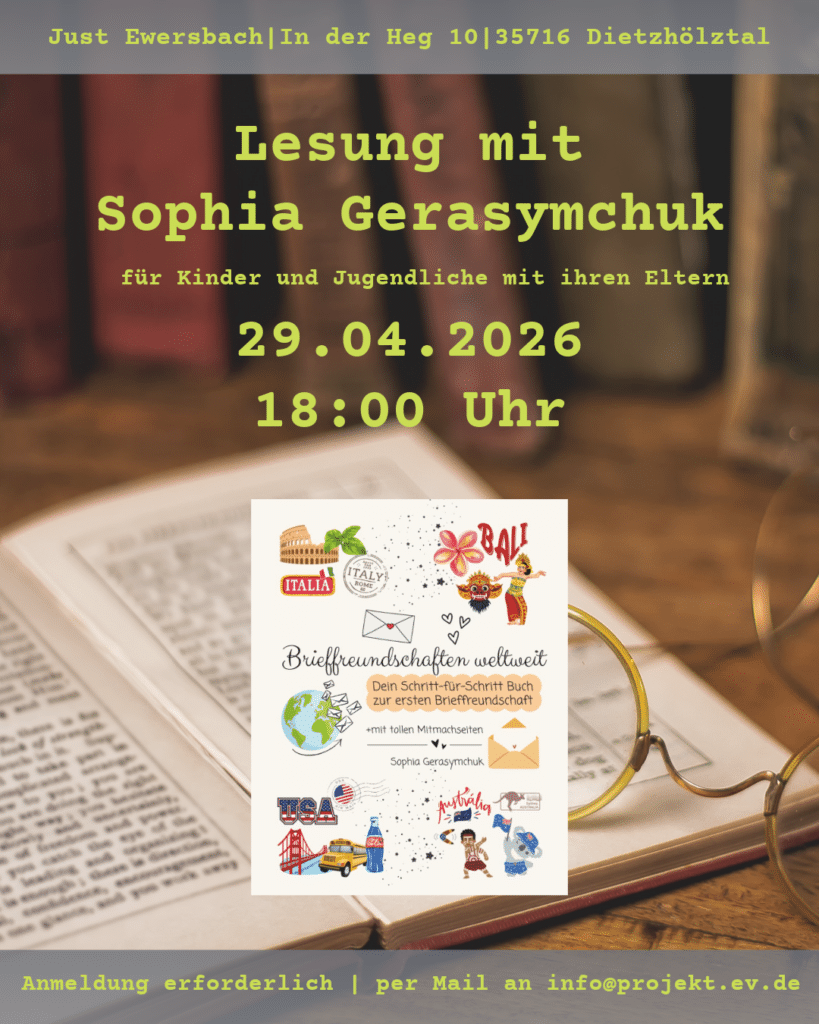 In ihrem Buch zeigt sie dir Schritt für Schritt, wie du deine erste Brieffreundschaft starten kannst. Du bekommst viele Ideen, Tipps und Anleitungen, die dir helfen, deinen ersten Brief zu schreiben, neue Freunde auf der ganzen Welt zu finden und dabei ganz nebenbei andere Kulturen kennenzulernen. Es geht um echte Verbindungen, Kreativität und darum, eine spannende Alternative zur digitalen Welt zu entdecken. Jetzt kannst du Sophia im Begegnungstreff Just am 29.04. von 18:00 bis 19:00 Uhr persönlich erleben. Viele sind nach ihren Lesungen voller Ideen nach Hause gegangen – vielleicht startest du danach ja deine eigene Geschichte. Komm vorbei – allein oder mit deinen Eltern – und lass dich inspirieren. Anmeldung bitte bis 28.04. per Email an info@projekt-ev.de